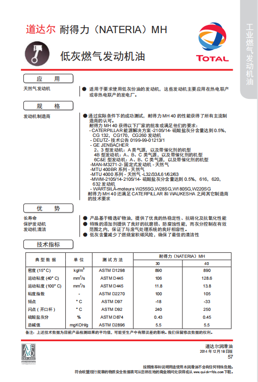 TOTAL道达尔耐得力NATERIAMH3040低灰燃气发动机润滑油包邮