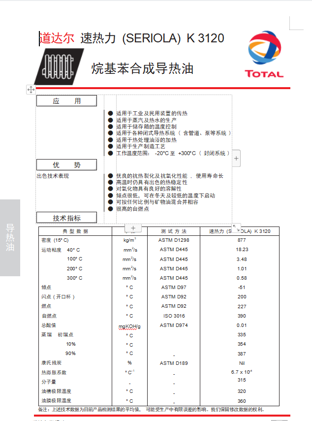 道达尔导热油TOTALSERIOLAK3120烷基苯合成传热油