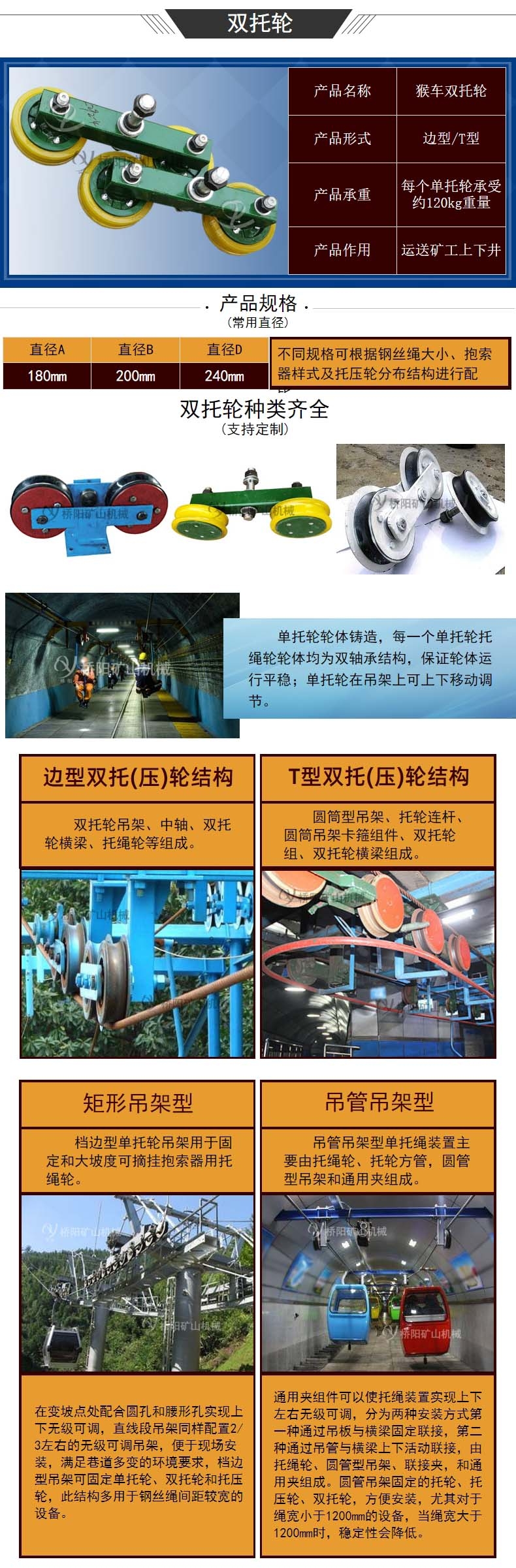 猴车托轮主要有两类单托轮和双托轮,猴车双托轮规格可分为直径180、直径200、直径240三种不同规格,根据钢丝绳大小、抱索器样式及托压轮分布结构进行配比。猴车单托轮和双托轮生产,品种、规格,猴车整机到配件及辅助材料配套,支持定制。