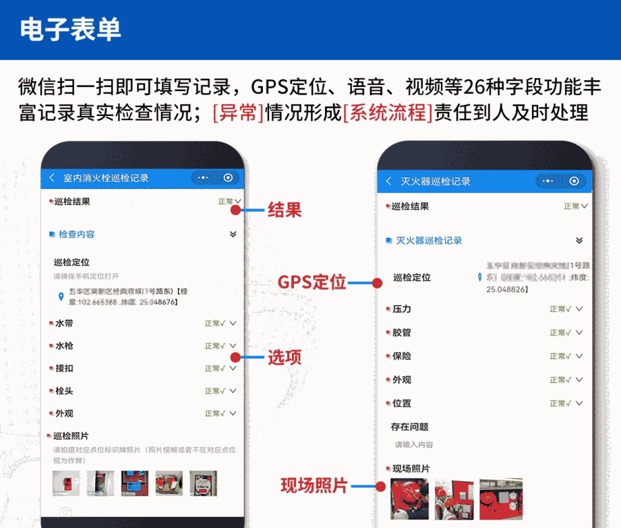 通过二维码+小程序搭建面向企业管理管理人员和内部\外部消防巡检人员的巡检系统;一方面,针对消防巡检利用图文引导,快速指引员工巡检,规范化巡检流程,及时提交巡检数据,提高巡检效率,减少漏检、误检;另一方面,使企业管理人员直观快捷的了解员工巡检情况,做到定时定点巡检,巡检数据回传后台可快捷了解巡检情况和设备状态。