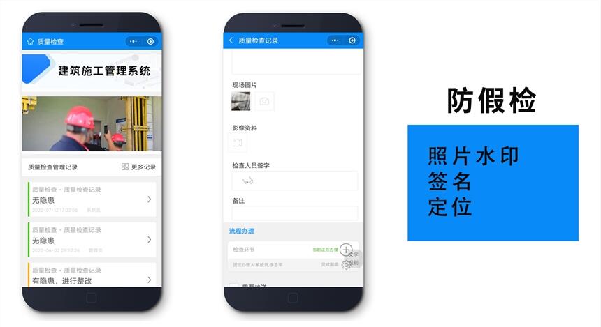 3. 流程闭环,现场检查记录质量隐患、视频,通过系统流转整改人,整改完成流转复查人复查,流程闭环。