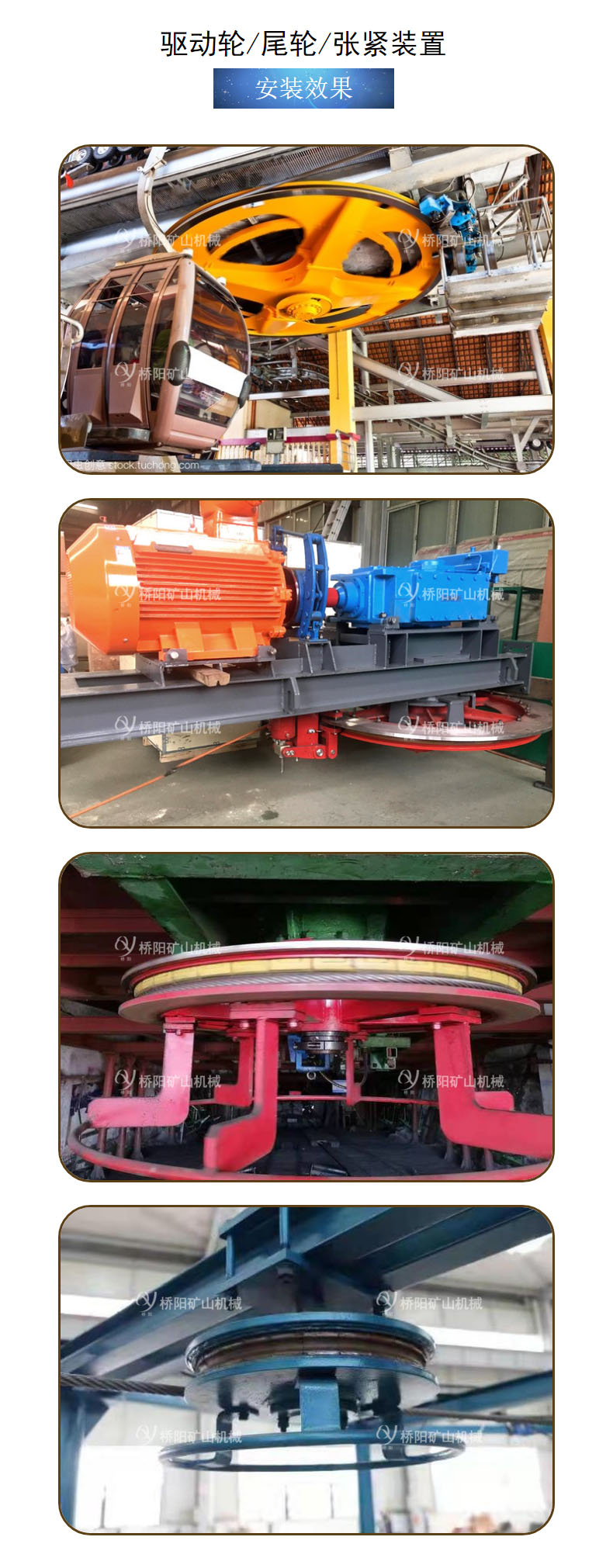 矿用索道主要由驱动装置,尾轮及张紧装置、乘人部分、钢丝绳、托(压)轮部分、电控部分及综合保护装置组成。矿用索道的驱动装置通常采用悬吊式或落地式安装。