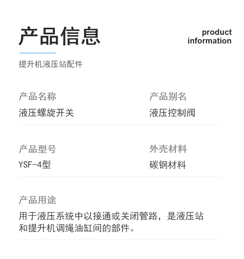 YSF-4型液压螺旋开关主要用于液压系统中,以接通或关闭管路,是液压站和提升机调绳油缸间的部件。可加装压力传感器,用以检测管路压力并参与实现报jing和自动控制。