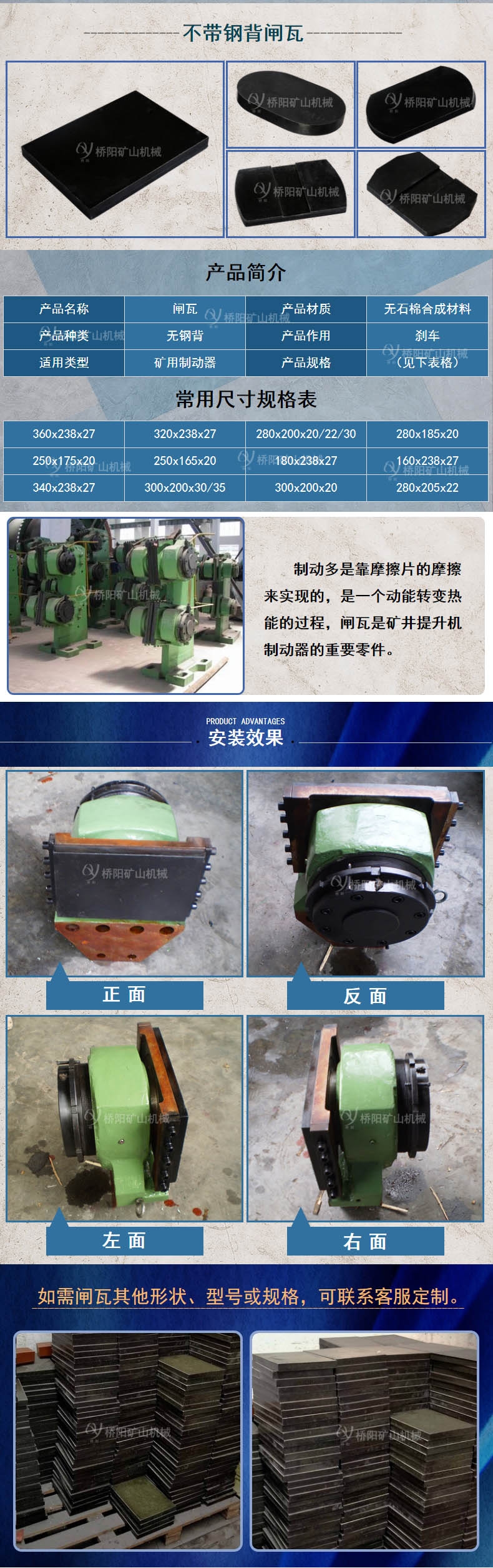 无石棉闸瓦,是一种采用树脂基并用其它增强纤维代替石棉的摩阻材料。闸瓦是矿井提升机制动器的零件之一,如果闸瓦的各种性能达不到设计要求,就会攸关设备能否正常运行。在矿井生产过程中,盘形制动器闸瓦频繁地与制动盘进行摩擦来控制提升机的运行。