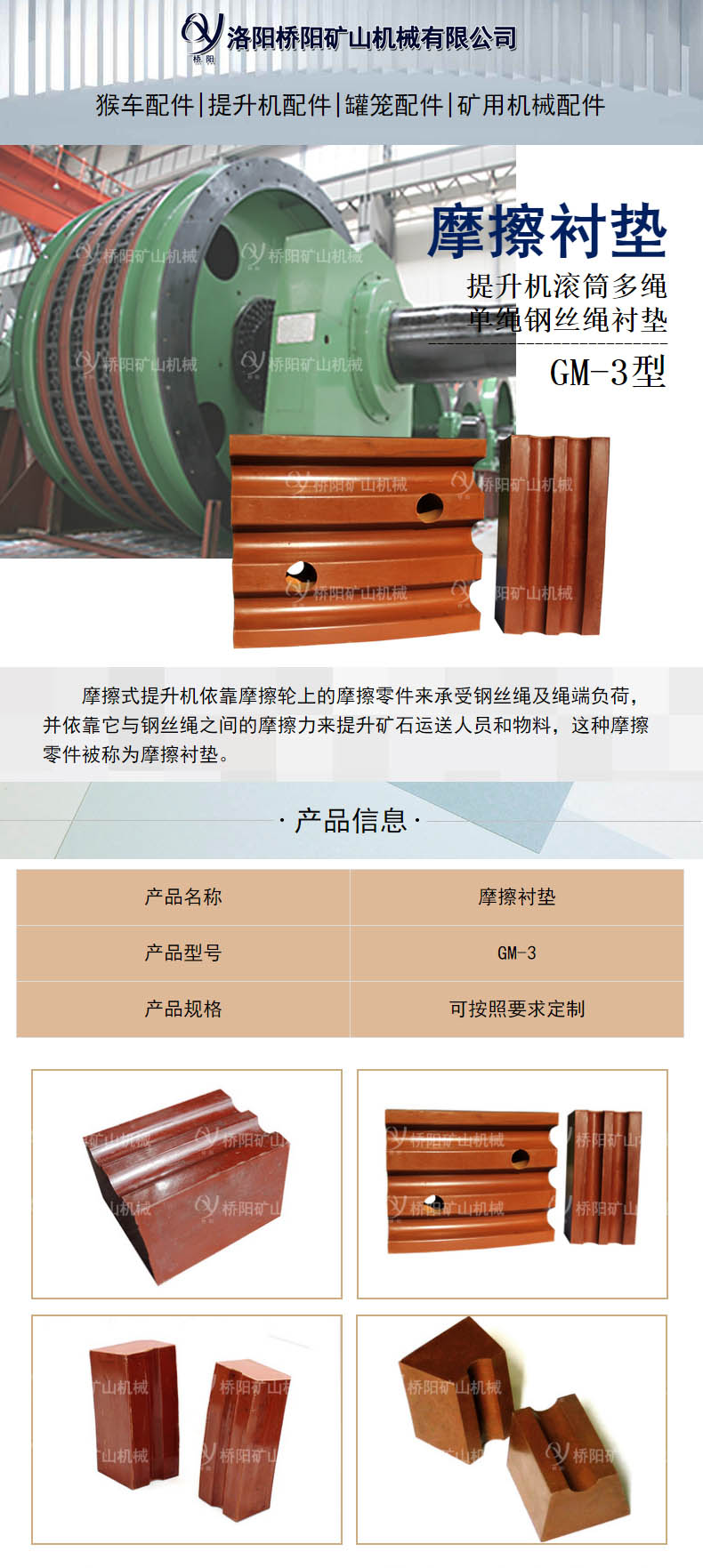 GM-3摩擦衬垫摩擦式提升机以其结构较紧凑,提升能力较大,适应范围较广,成为矿井提升机的主流设备。摩擦衬垫作是多绳摩擦式提升机的部件之一。满足多绳摩擦式提升机的使用要求。