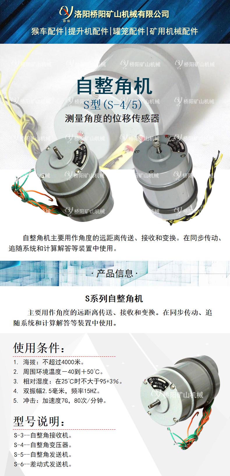 主要用作角度的远距离传送、接收和变换。在同步传动、追随系统和计算解答等装置中使用。使用条件说明:海拔:不超过4000米。周围环境温度-40到+50℃。相对湿度:在25℃时不大于95+3%。双振幅2.5毫米,频率15HZ。冲击:加速度7G,80次/分钟。