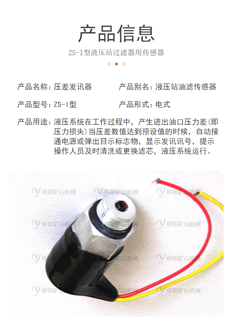 洛阳桥阳矿山机械有限公司生产的压差发讯器型号齐全,主要有CMS,CS-V,CM-I,CS-IV,CZ-II,CS-III,CYB-I,ZKF-II,CY-II,YM-I,ZS-I,CM-I-F等。洛阳桥阳矿山机械有限公司生产ZS-I型真空压力式发讯器,连接螺纹是M18×1.5。这款压力发讯器是用来借助吸油过滤器配套保护油泵的配件。