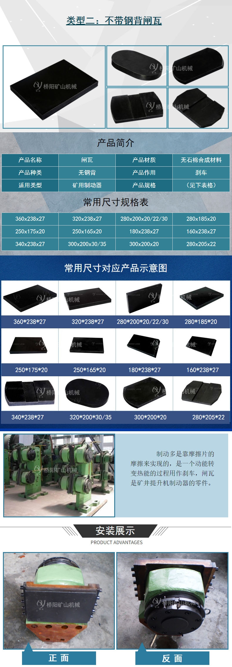 无石棉闸瓦,是一种采用树脂基并用其它增强纤维代替石棉的摩阻材料。闸瓦是矿井提升机制动器的零件之一,如果闸瓦的各种性能达不到设计要求,就会攸关设备能否正常运行。在矿井生产过程中,盘形制动器闸瓦频繁地与制动盘进行摩擦来控制提升机的运行。