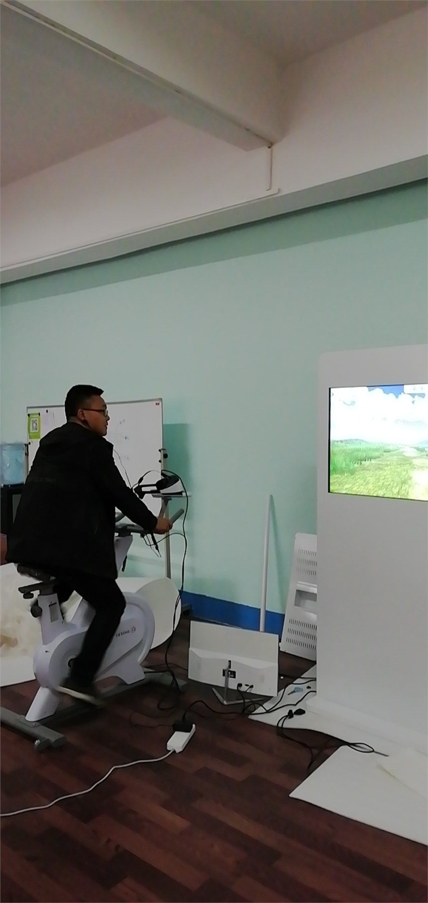 一、产品特点 1、产品功能:运动放松系统包含运动减压、虚拟体验、心理竞技、心灵放松四大模块,通过运动调适单车高科技生物心理采集装置,实时监测采集用户的骑行速度、车行阻力、运动距离、心率、卡路里消耗等经典指标,智能选取专业指导语进行反馈,及时指导体验者进行身心调整,给予积极心理指导,以达良好的调适效果。 2、系统通过勇闯八关、单车越野、漫游阳澄湖、守护阳光等19种不同的心理游戏,以缓解或消除用户紧张、焦虑、抑郁等消极情绪,提升其自控力、专注力和意志力。 3、身心调适运动放松系统是一款以智能单车为载体,通过趣味骑行,以促进体验者心智发展,帮助其达到积极健康的心理状态的智能运动心理产品。通过身体运动的方式,使体验者在运动过程中释放“快乐因子”——多巴胺,有效进行身心调整,达到运动宣泄放松效果。 二、产品配置 1、产品展开尺寸:136*85*55cm;净重:25KG,使用者大负荷重量:100KG、系统可以无线数据传输。 2、 产品特点:3KG磁控惯性轮;EMS电磁阻力控制系统;1pcs曲柄;皮带传动顺畅无声音;鞍座高低可调;车把任意角度转动,前底管条纹脚套,移动方便;单车尺寸:100*61*28,配备单车手柄感应器,可实时进行生理指标(心率)监测。 3、4D互动仿真训练系统; 4、万向车把智能操控系统; 5、生理指标监测反馈系统; 6、训练评估指导管理系统为一体的运动调适放松系统; 7、42寸大屏幕反馈式触摸液晶一体机; 8、智能无线蓝牙连接传输器;