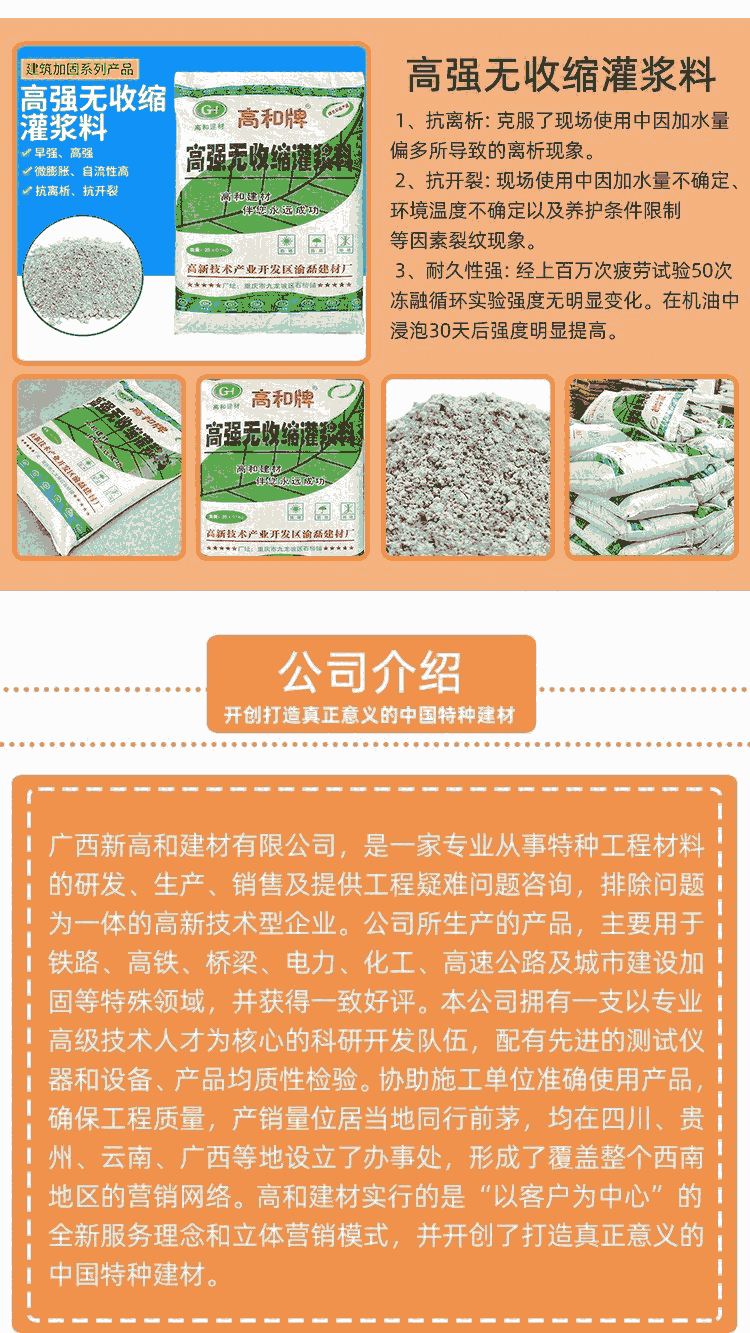 6、耐久性强:本品属无机胶结材料,使用寿命大于基础混凝土的使用寿命。