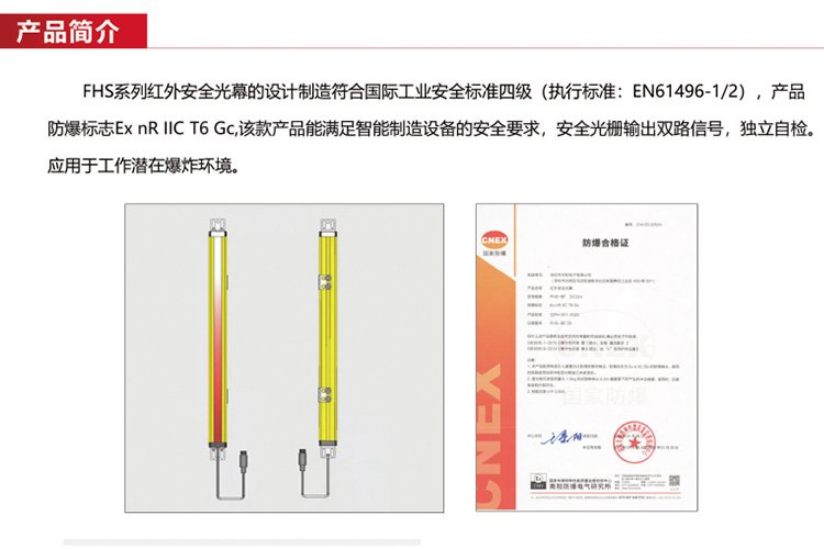 品拓的防爆光栅不同于普通的安全光栅,防爆光栅的要求更高,确保不产生电火花,在危险易爆的环境中起到保护人身安全的作用。防爆光栅是由红外线安全光栅经过特殊工艺处理设计制造符合国际工业安全标准(执行标准:EN61496-1/2),品拓防爆光栅的防爆标志为Ex nR IIC T6 Gc,该款产品主要应用于适用于爆炸性气体环境2区危险场所、 IIA、IIB 、IIC级爆炸性气体环境、可燃性粉尘环境20区、21 区、22区环境、温度组别为Tl-T6的环境,防护等级IP65。