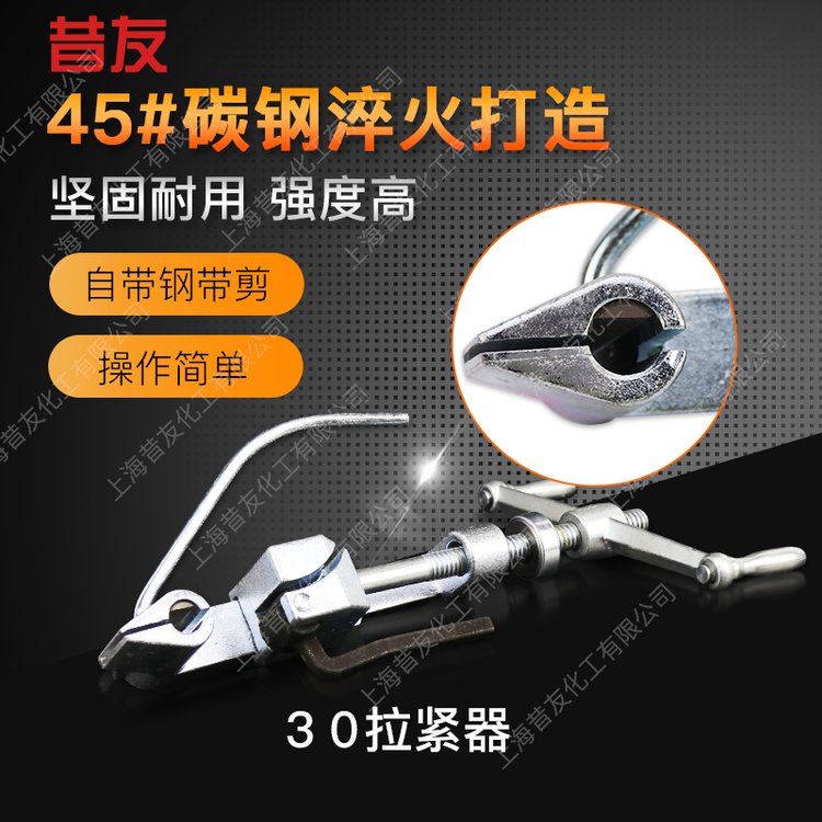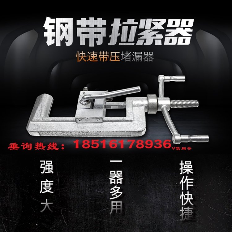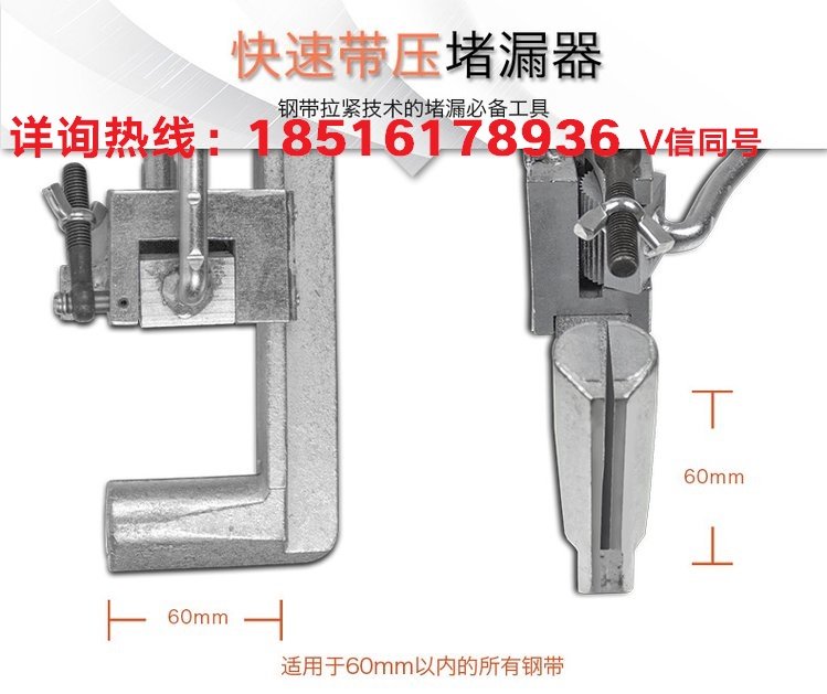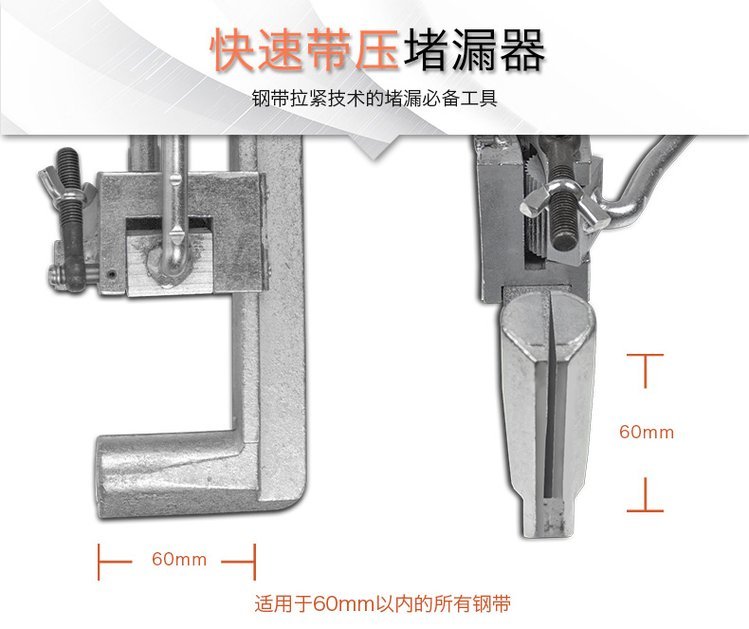60钢带拉紧器:优点:强度大,可以为泄漏压力5MPa以内的所有管道拉紧锁死钢带,操作方便快捷,一器多用,配备一把G9-60钢带机拉紧器在带压堵漏抢险中可拉紧宽度小于60毫米的所有钢带,为带压堵漏施工标准Q/05031GBDDS 的器具标准配置系列,另购买K60钢带剪刀配套使用.