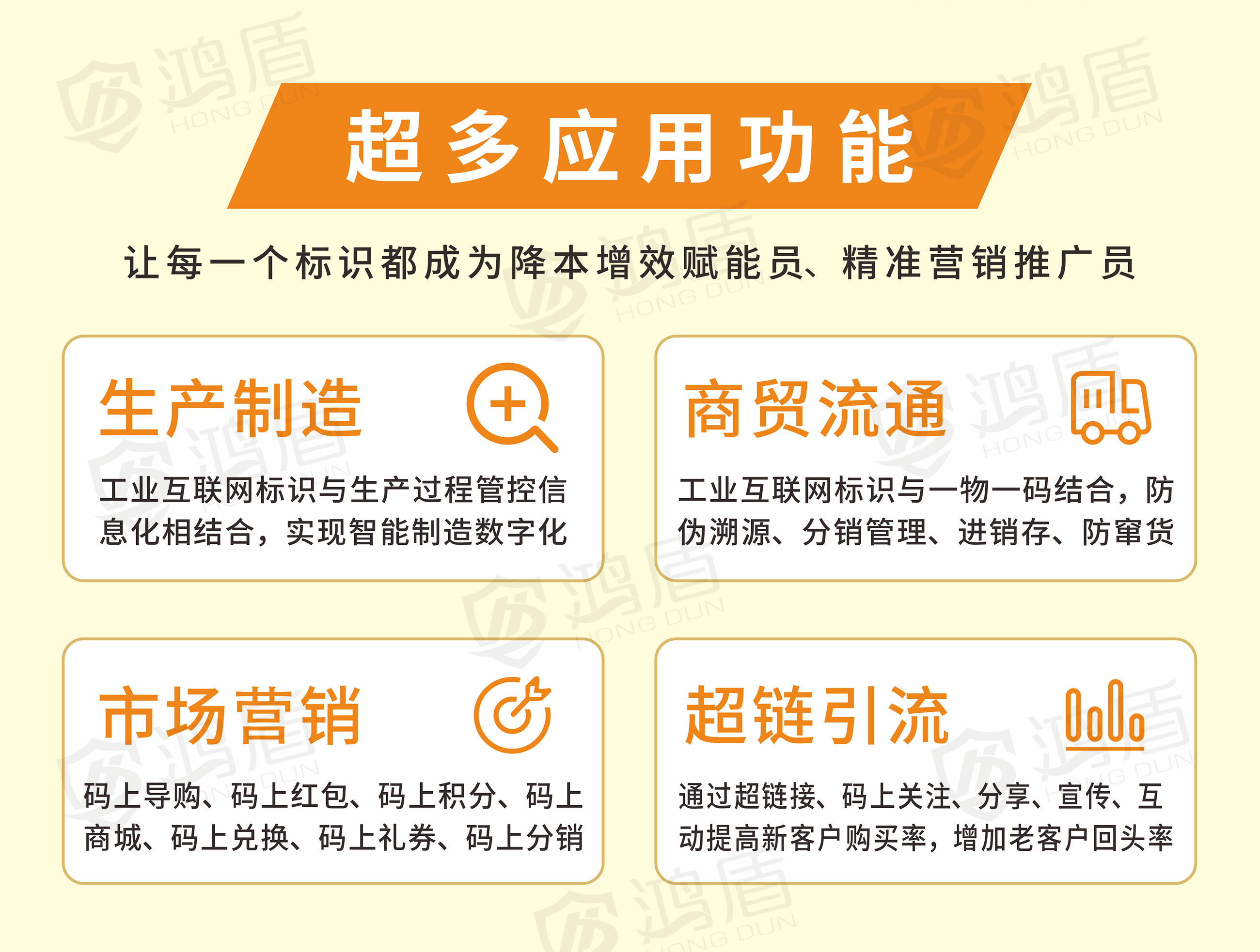 功能 | 防伪,溯源,红包营销,防窜货追溯,电子质保,其他定制功能 | ||
