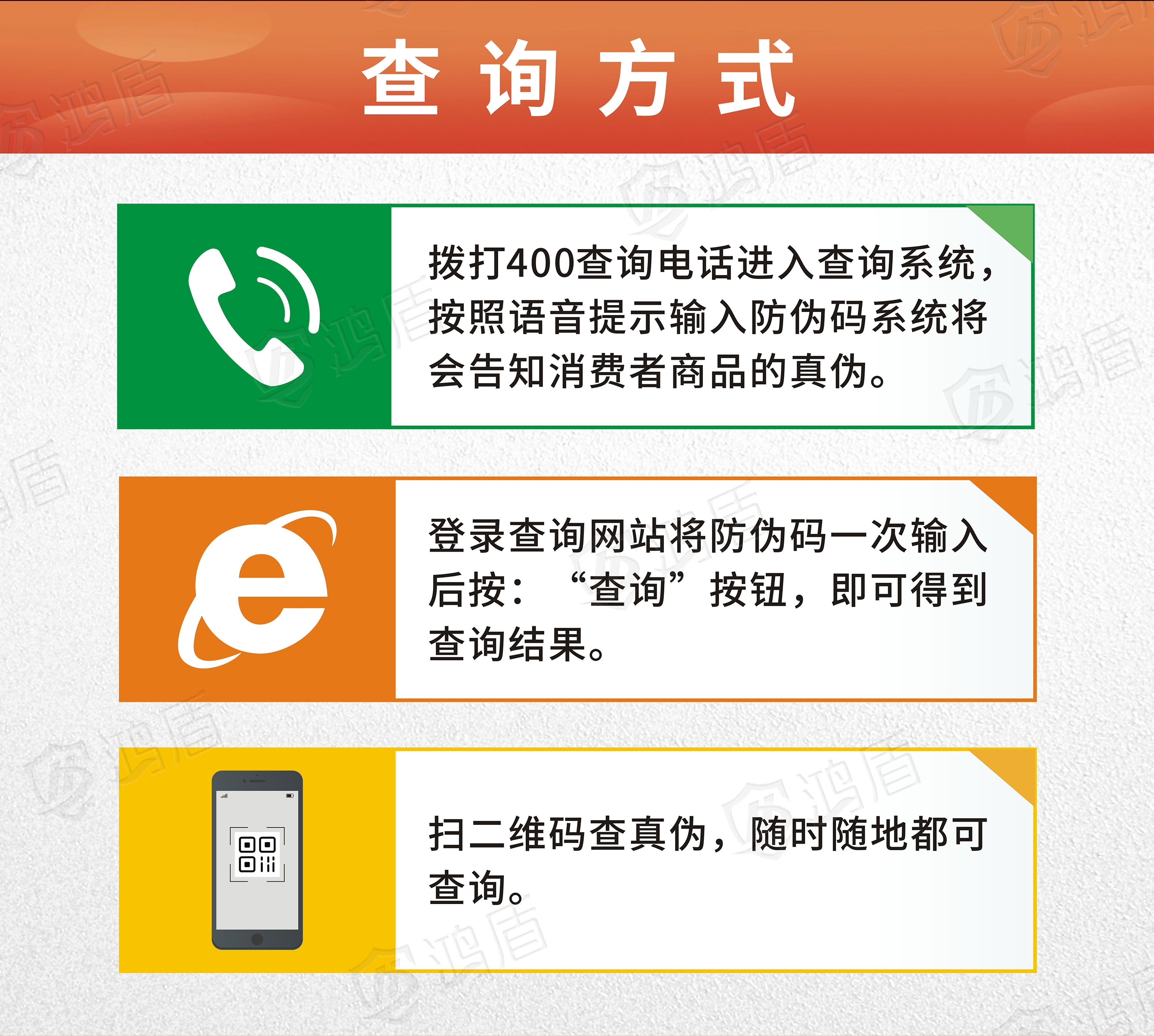 防伪方式 | 400电话,数码防伪,电码防伪,二维码防伪,其他防伪方式 | ||