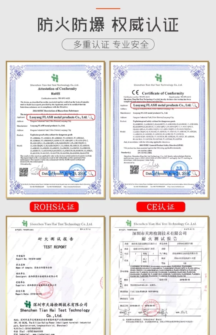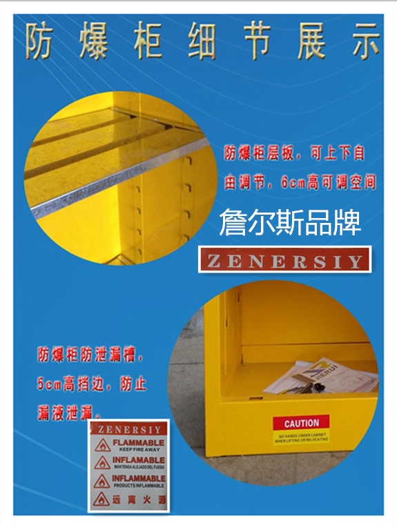 东莞市詹尔斯工业设备有限公司坐落在东莞市黄江镇,是一家集研发,生产,销售,售后为一体的大公司。公司本着立足东莞,服务全国的先进理念创办。高资注册,租赁宽阔的厂房,聘请高素质,高知识人才研发。招收了一批经验丰富的技工,保证每件出品的产品质量合格,我司是生产防爆柜厂家,防火防爆柜是储存各类生产性或者生活性物质或者资料的安全防护用品,黄色防火防爆柜用于存储如丙酮,燃料(天然气,柴油,喷气燃料)和汽油等易燃性液体,红色防火防爆柜于存储存易燃液体,如气溶胶,油墨和涂料,蓝色防火防爆柜用于存储任何类型丙酮醇,烷基硫酸等腐蚀性的酸基化学品。您可以根据需要选择。产品符合OSHA 29 CFR 1910.106 和 NFPA CODE30标准,已经通过FM认证、CE认证,广泛应用于COC验厂,化工厂,涂料厂等各类工厂,可以保护化学品安全,适当减少火灾带来的人员受伤的危险…