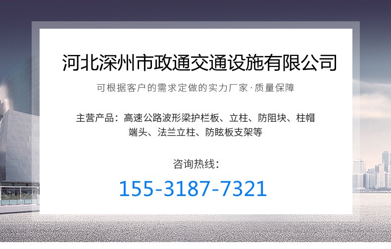 多年来,深州市政通交通设施有限公司始终把生产高质量的护栏板产品作为企业的立业之本。把提高产品质量,提升研发能力作为企业的发展方向。公司现有工程师及研发人员十多名,生产人员近百名。配有先进的测试仪器及加工设备,CAD设计软件。面对日益激烈的市场竞争,公司实施ISO9001质量管理体系和ISO14001环境管理体系,获得国际认证。公司开展全员培训,转变观念、完善提高、强化修炼、调整战略,将本土优势转化为先求生存,后求发展的核心竞争力,使公司在新的世纪里保持稳定的发展势头,抓住机遇,迎接挑战,与时俱进。我们拥有先进的管理经验,生产流程和质量控制手段,保证了为客户提供高质量的产品……