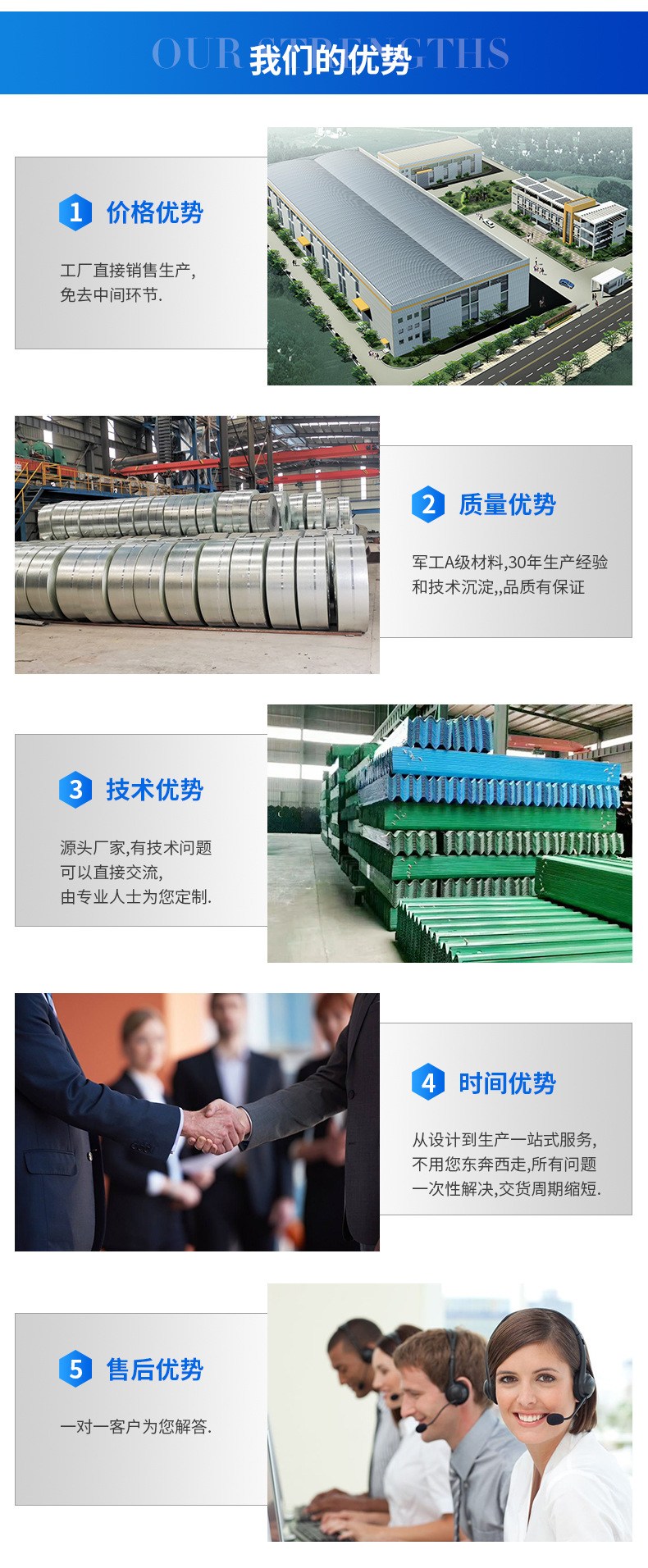 我们的主要业务包括:高速公路护栏板、波形护栏、桥梁护栏的生产、销售与安装。我公司引进先进的冲压、切割、磷化、冷镀锌、热镀锌、大型静电喷塑等全套生产设备。产品通过了工程监理检测中心(国家交通安全设施质量检测中心)的验收,全部符合:交通行业标准JT/T281—2007《高速公路波形梁钢护栏》、国家标准GB/T18226-2000《高速公路交通工程钢构件防腐技术条件》。年生产能力为15万吨.
