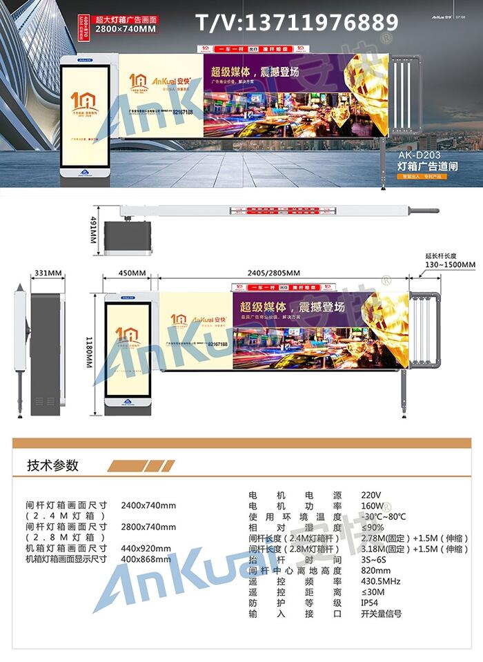 8.闸杆长度(2.4M灯箱杆):2.78M(固定)+1.5M(伸缩)/闸杆长度(2.8M灯箱杆):3.18M(固定)+1.5M(伸缩)