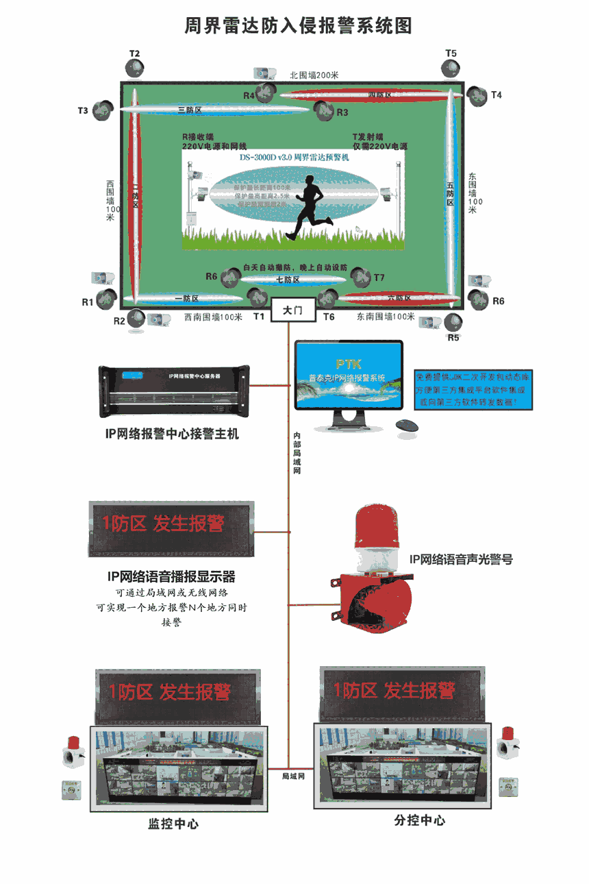 外监墙每80米,内监墙80米要安装一台网络红外枪式摄像机,7*24小时对监墙外10米内进行设防,监墙内5米内安装围栏进行设防,监墙内1米处每100米安装一组DS-3000DV3.0语音雷达预警机,当可疑人员进入警戒区或者穿越警戒线时,报警主机产生报警,通过现场喊话喇叭警告罪犯停止犯罪行为,将报警信息同时上传到的监控中心和武警监控中心,在监控中心自动弹出报警电子地图,联动视频图像,并可在多个的监视器上同时弹出报警位置视频画面,并监控中心语音LED电子屏上显示和男声自动播报警情信息。。实现对区域、目标周界等要害部位的“一点触警、多点显示、多级联运”,电子地图准确定位,处置方案视频图像自动显示,辅助设备自动开启,语音LED电子播报警情。