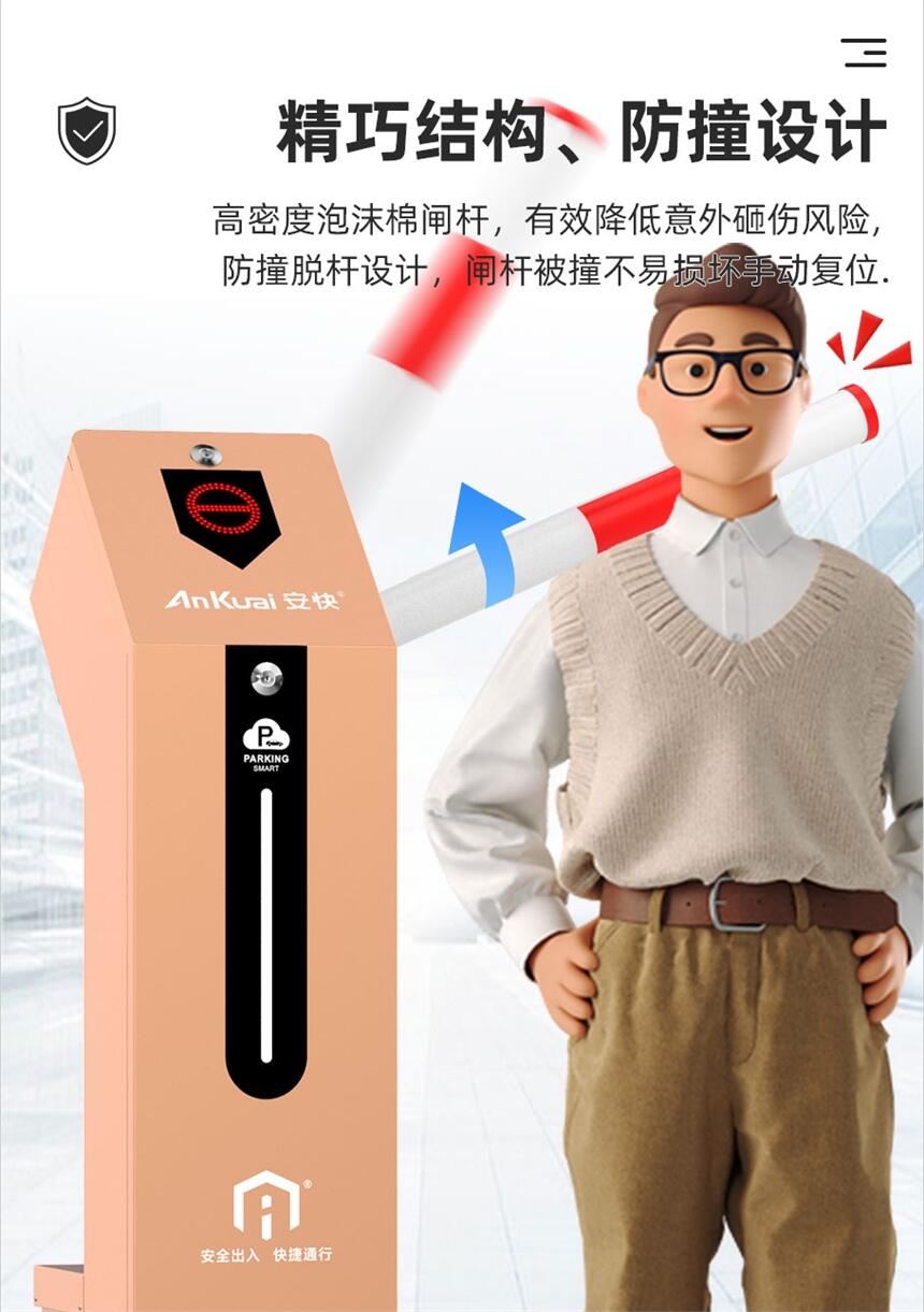 3.精巧结构、防撞设计:高密度泡沫棉闸杆,有效降低意外砸伤风险;防撞脱杆设计,闸杆被撞不易损坏手动复位。