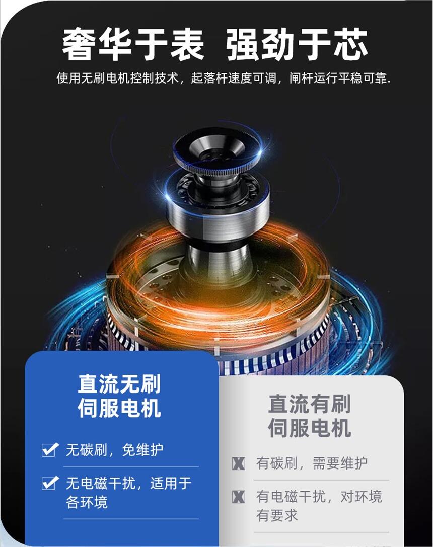 1.D158采用DC24V直流无刷电机、一体化机芯、精密四连杆结构,噪音小,运行平稳,相对栅栏杆,直杆可无弹簧起降。
