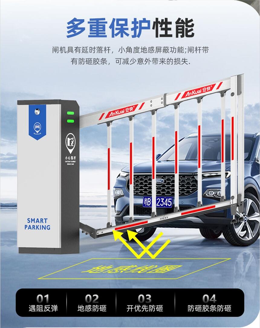 5.地感防砸:闸杆在下落过程中,如接收到地感信号后,便会自动起杆,触发期间不落杆,待地感信号恢复后,闸杆自动下落,确保安全。
