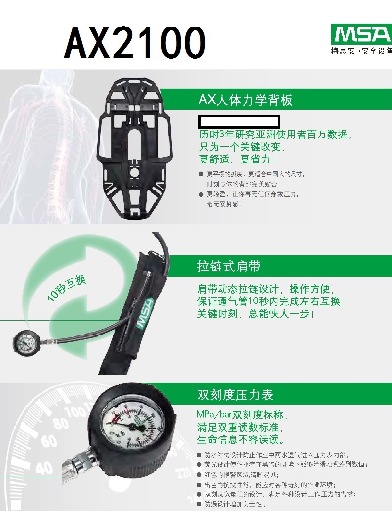 7.空气呼吸器背托:背托设计符合人体工程学原理,由碳纤维复合材料注塑成型,具有阻燃及防静电功能,质轻、坚固,在背托内侧衬有弹性护垫,可使配戴者舒适。