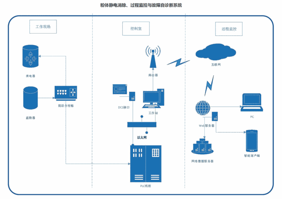 KD-FCP1粉体静电消除、过程监控与故障自诊断系统是与装置区料仓风送系统对接的整体控制设备,它由PLC+工作站控制系统、现场分控箱、消电器本体、静电监测器本体以及支持控制系统信息数据处理的通讯系统等组成。