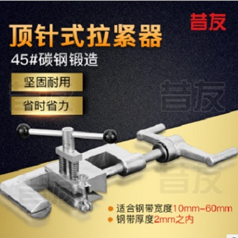 使用60mm宽2mm厚以内卡带,用于法兰卡带拉紧时使用,用摇杆顶针卡紧法兰卡带,可在拉紧时不会滑落,从而保证卡带紧贴法兰上,不会产生大缝隙导致胶棒飞出。