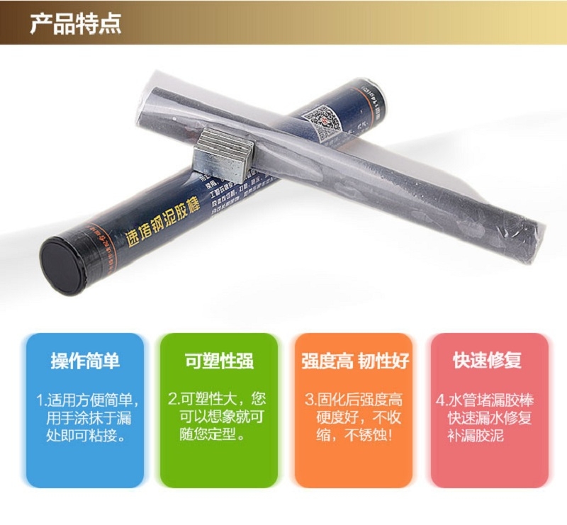 一、形状如橡皮泥、当金属管线和容器罐穿孔泄漏,用此品可以在泄漏时直接塞堵到泄漏孔上,也可以粘接在薄弱部位起到加强作用,堵漏补强佳品。