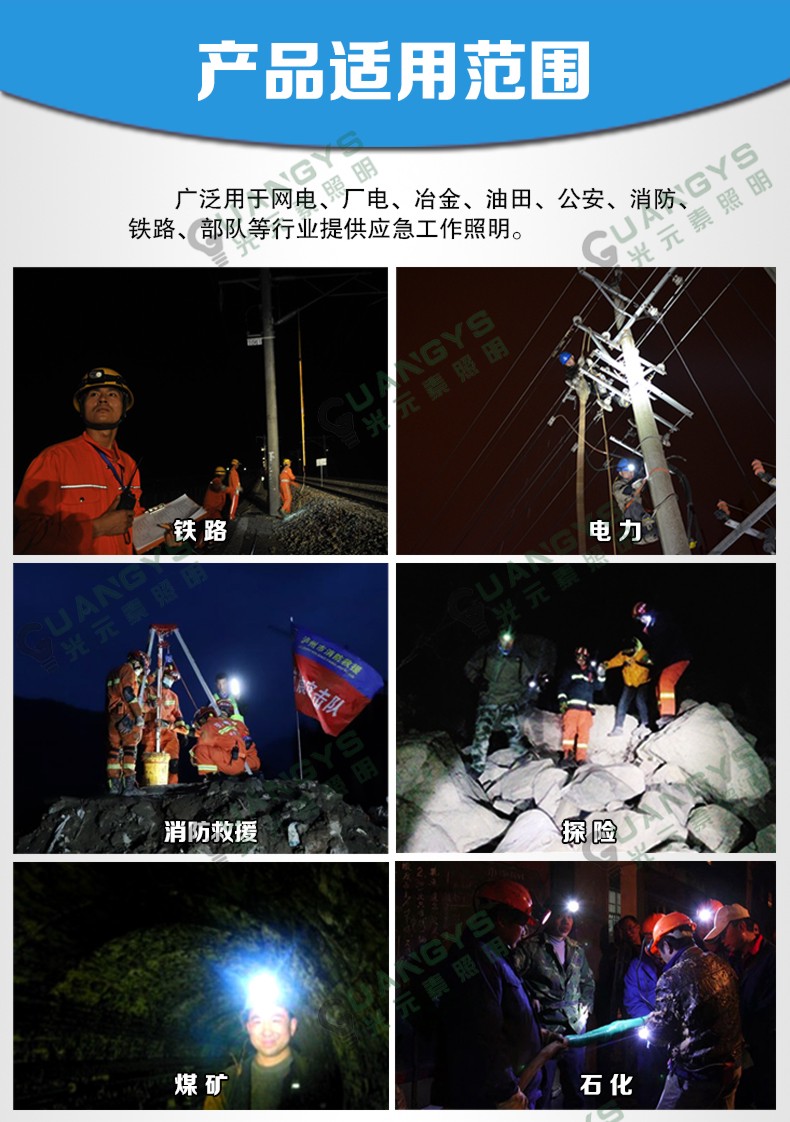 适用环境 | 网电、厂电、冶金、油田、公安、消防、铁路、部队等行业提供应急工作照明 | ||