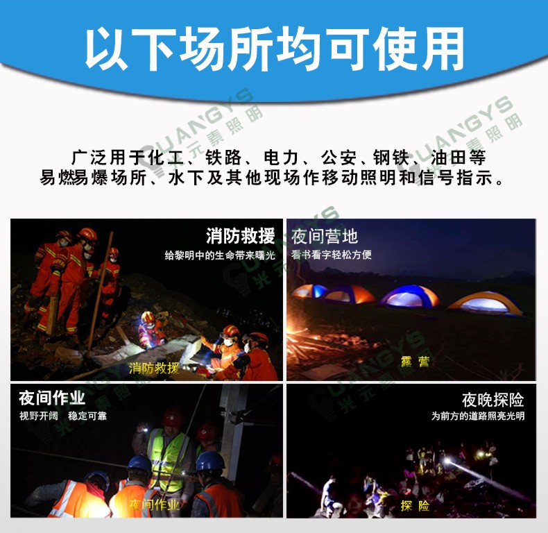 应用场景 | 消防 户外 公安,’油田、石化、电力、冶金、船舶等行业巡视、检修时的便携式照明 | ||