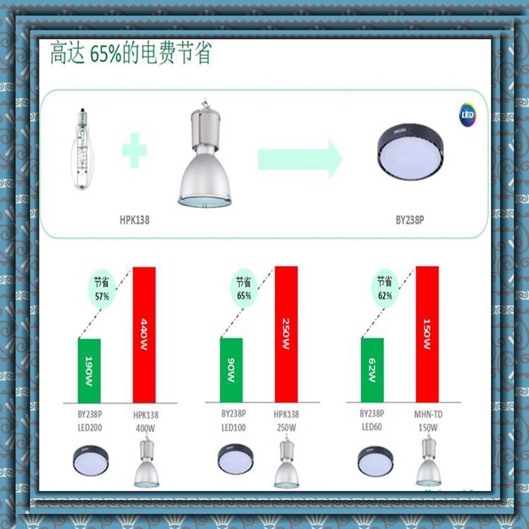 1、替换 MNH-TD150W, HPI-P 250W 及 HPI-P 400W 传统高天棚节省65电费