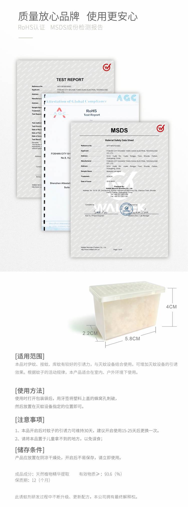 GOKDA发明专利诱蚊剂,专业配比诱蚊成份,有效诱捕白纹伊蚊、按蚊、库蚊。纯生物诱蚊信息素。使用安全、环保,可大幅提高灭蚊的诱蚊、捕蚊效果。也适用于其它品牌的灭蚊灯使用。已通过国际安全ROHS环保认证? ?
