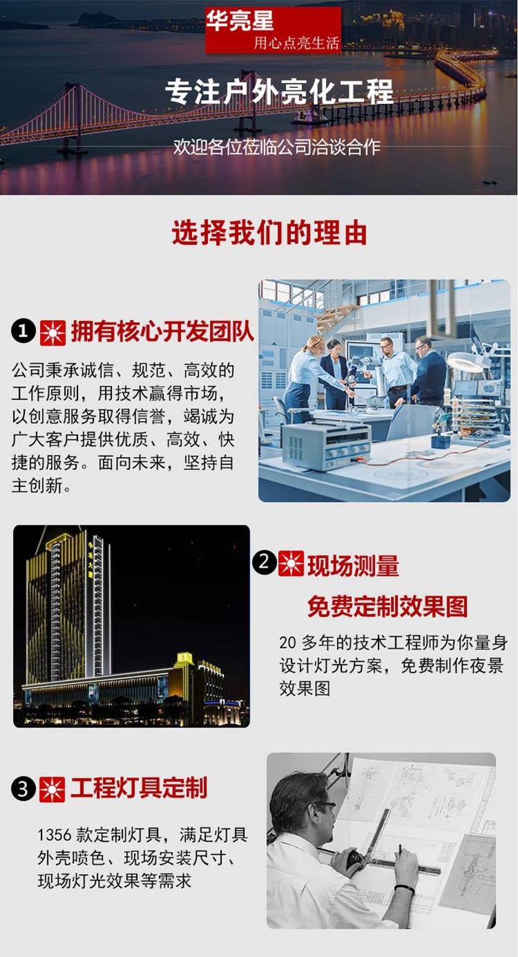 主要适用范围 | 园林景观工程,公园亮化工程,城市亮化工程,楼体亮化,广场铺装装饰亮化,照明亮化工程户外场所 | ||