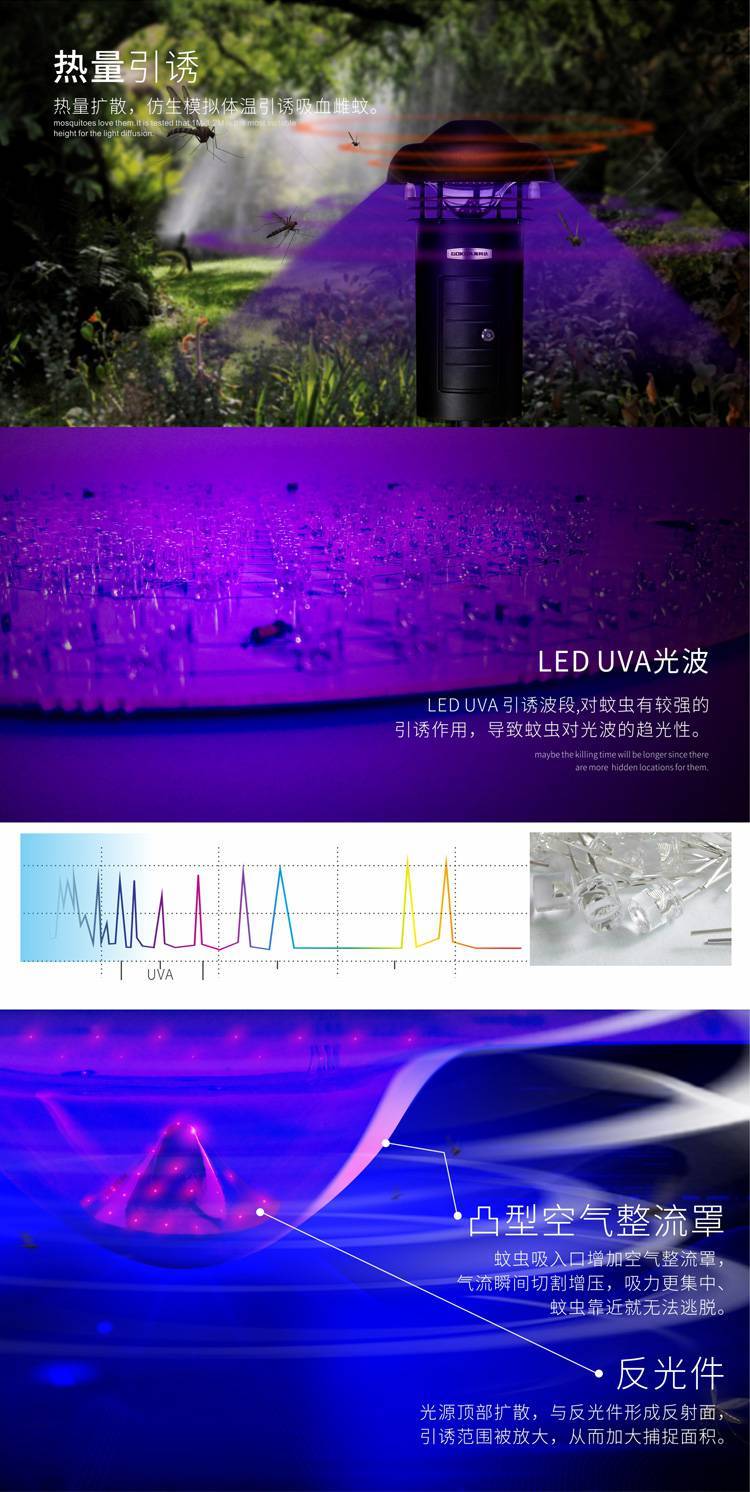 高科达GOKDA户外灭蚊灯风吸式灭蚊,使用全金属机身,工业设计造型美观,具户外照明、灭蚊、环境装饰一体化功能。运用生物诱蚊技术和物理灭蚊设备,花园灭蚊虫采用诱蚊光波 蚊虫信息素气味 体温模拟引诱蚊虫靠近,高速旋转的涡流风机将蚊虫吸入储蚊盒并风干至死,安全。从而达到绿色除虫、环保灭蚊的目的。