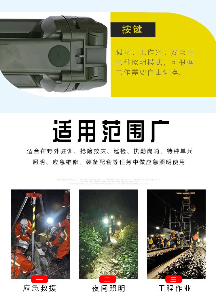 适用场所 | 野外驻训、抢险救灾、特种单兵照明、应急照明 | ||
