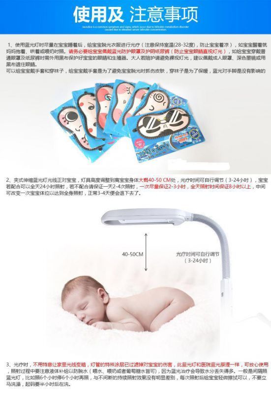 使用时取下防护档板,可用金属线吊绑起支架(要固定牢靠),光线正对宝宝,宝宝只需穿纸尿裤和戴眼罩即可,约距50CM左右,尽量在宝宝睡着时照,如真心心疼宝宝的话,尽量哄着照,或抱着,或喂奶,都可以。时间可自行调节,亦可连续照24小时,中间要注意补充水份,多喝水。(另有不明白之处可咨询店主,不另配说明书,谢谢).