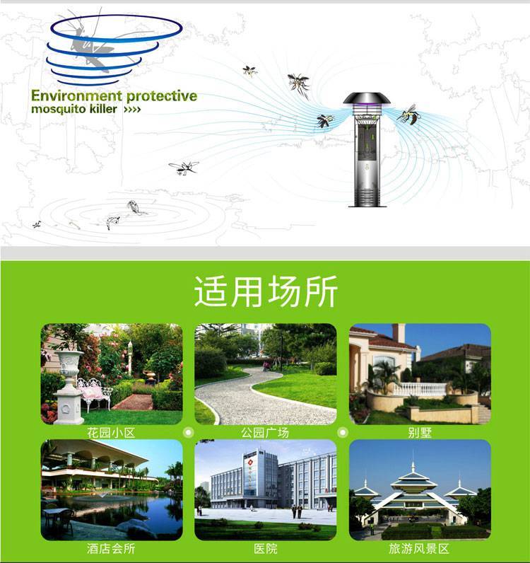 草坪灯式户外灭蚊灯适用环境: 花园别墅、市政公共绿地、宾馆、度假地、俱乐部会所、学校、公园、医院等。