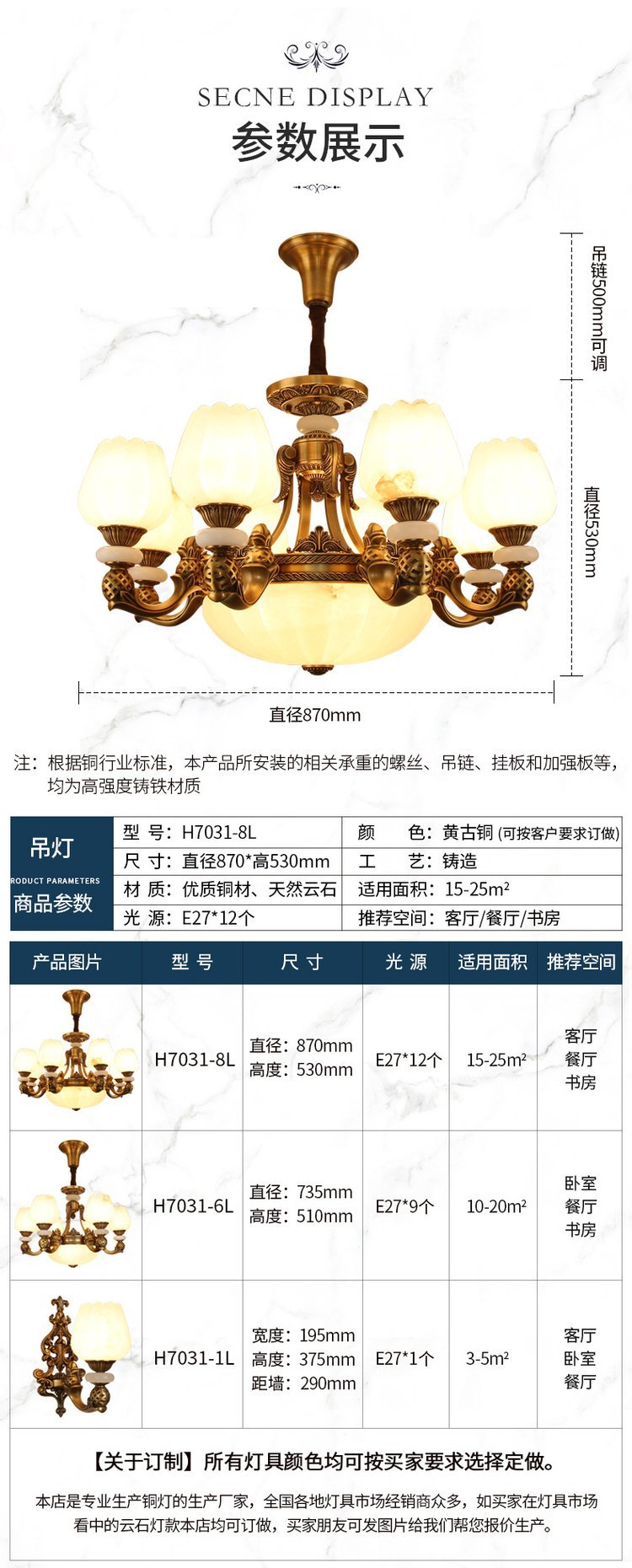 常用规格 | 单头壁灯,6头全铜云石,8头全铜云石 | ||
