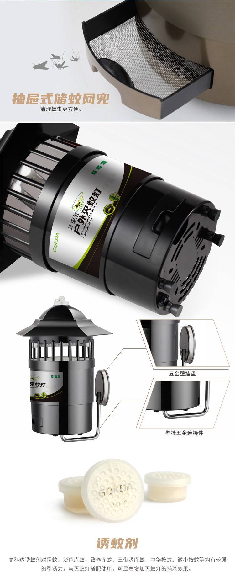 壁灯式户外防水灭蚊灯产品特点:可当草坪灯、庭院灯、壁灯使用(高效、环保、安全灭蚊)。