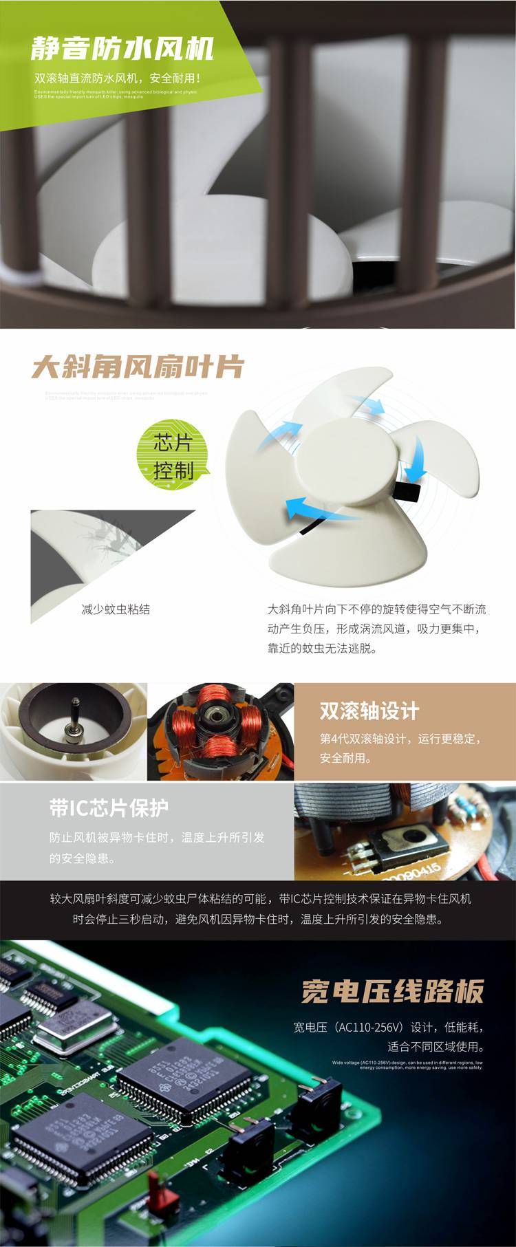 利用机内的直流防水静音12V涡轮风扇将蚊虫吸入机内迅速脱水致死,安全无污染,无毒副作用。