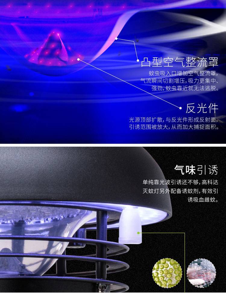 高科达GOKDA草坪灭蚊灯使用全金属机身,工业设计造型美观,具户外照明、灭蚊、环境装饰一体化功能。运用生物诱蚊技术和物理灭蚊设备,采用订制进口LED UV诱蚊芯片所散发的365紫外诱蚊光波 蚊虫信息素气味 体温模拟引诱蚊虫靠近,高速旋转的涡流风机将蚊虫吸入储蚊盒并风干至死,安全无污染。从而达到绿色除虫、环保灭蚊的目的。