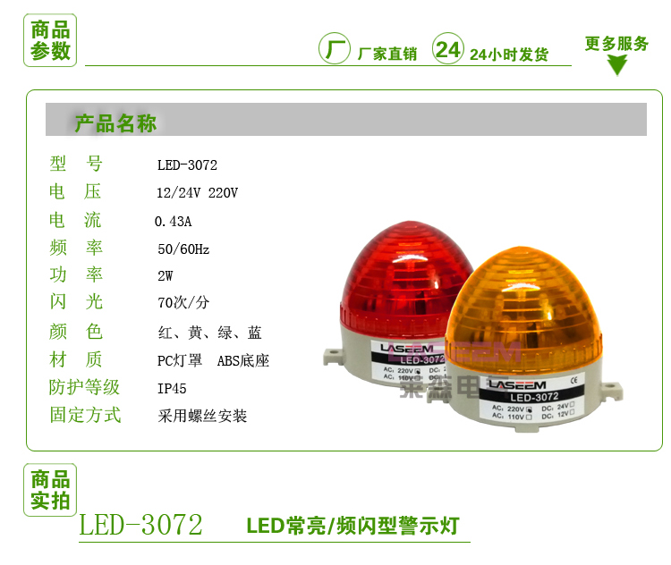 5、适于用恶劣环境下正常工作警示灯通常是用在机械设备等开发。一般情况下,用处可以提供多样的长度的产品的,有灯罩组合的构造,需要时一边方向的灯罩可以组合复合颜色。此外,还可以根据光源形式的不同,分为:1灯泡旋转灯;2LED闪光灯;3氙气灯管频闪灯,其中LED闪光形式的是灯泡旋转形式的升级版,使用寿命更长,更节能,更环保!