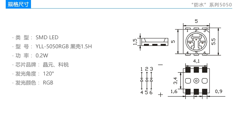 防水系列5050RGB 1.5H LED灯珠规格:功率0.2W