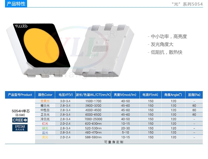 光系列5054H LED灯珠特性及参数:中小功率、高亮度、发光角度大、低阻抗、散热快
