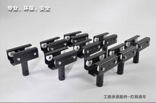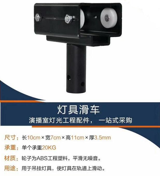 又称挂灯滑车,其作用是吊挂灯具,使灯具吊挂于铝合金轨道上,灯具可在铝合金轨道上左右灵活移动,便捷调光,演播室灯光采用轨道安装方式需使用灯具滑车。灯具滑车其材质采用3.5mm铸钢,结实耐用,承重力强;滑轮材质为ABS工程塑料,特点是滑动无噪音、轻巧。