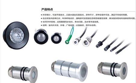 特点:精致小巧、内控自变呼吸错位变化、2芯线通电即可布线方便。也可DMX512外控,丰富变化效果可适用室内天花、户外广场、草地、台阶、墙壁水池等,可根据不同现场定制体型,出线方式,安装方式