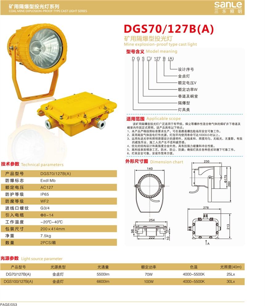 执行标准:DGS70/127L(A)矿用隔爆型LED投光灯依据GB3836.1-2010、GB3836.2-2010标准设计制造。