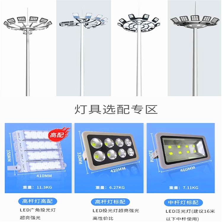 35米高杆灯基础35米高杆灯配制,高杆灯一般指15米以上钢制柱型灯杆和大功率组合式灯架构成的新型照明装置。它由灯头、内部灯具电气、杆体及基础部分组成。灯头造型可根据用户要求、周围环境、照明需要具体而定;内部灯具多由泛光灯和投光灯组成,光源采用N G 400高压钠灯,照明半径达60米。杆体一般为圆柱型独体结构,用钢板卷制而成,高度为15- 40 米。